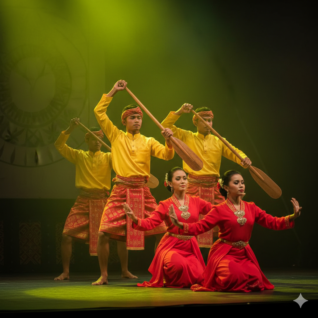 Práce s pádlem: Pádlo (pengayuh) je klíčovou rekvizitou. Tanečníci jím rytmicky klepou o podlahu nebo s ním synchronizovaně manipulují ve vzduchu, což symbolizuje pohyb lodi.