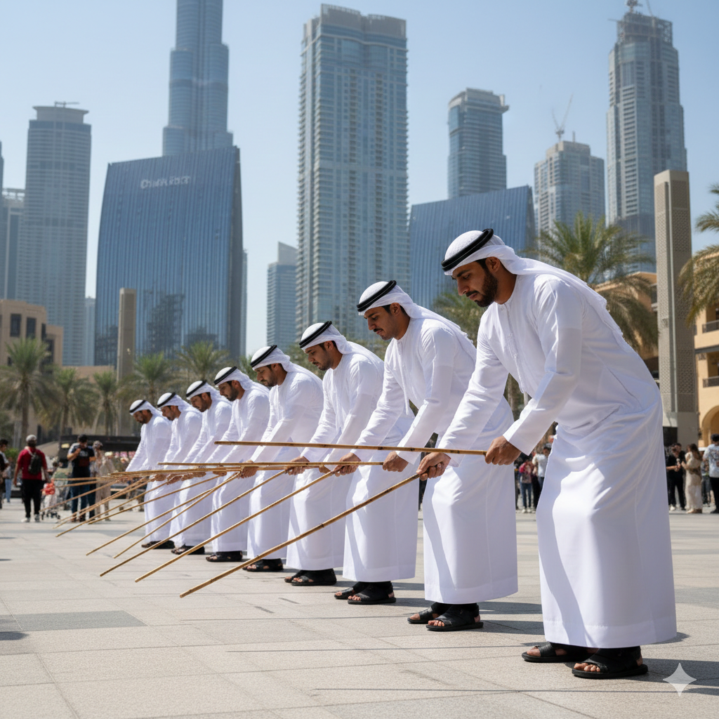 - Je běžné vidět vládce a šejky Emirátů, jak se během národních oslav připojují k řadě tanečníků a tančí s holí v ruce, čímž vyjadřují pouto se svým lidem.
