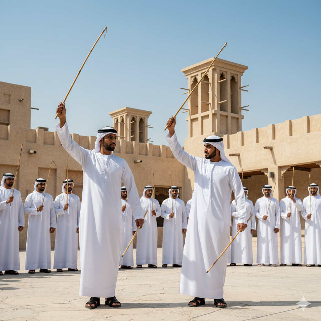 V historickém kontextu šlo o demonstraci "muru'a" (arabský koncept mužnosti a rytířství). Tanec simuluje setkání dvou skupin, které spolu nevedou fyzický boj, ale spíše soutěží v eleganci pohybu a pohotovosti slova. I když jsou pohyby úsporné, každé lehké švihnutí tenkou holí z bambusu (al-khayzaran) a každé rytmické pokývnutí hlavou nese význam hlubokého respektu k tradicím předků, kteří v nehostinné poušti přežívali díky disciplíně a soudržnosti.