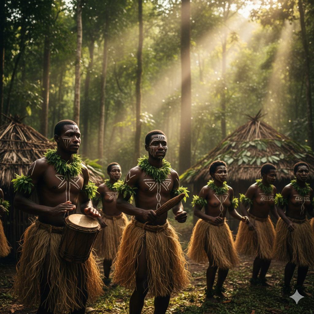 - Pralesní perkuze: Rytmus nevytvářejí klasické bubny jako v savanách, ale údery tyčí do velkých dřevěných trámů ležících na zemi, chřestidla z přírodních materiálů a rytmické tleskání.