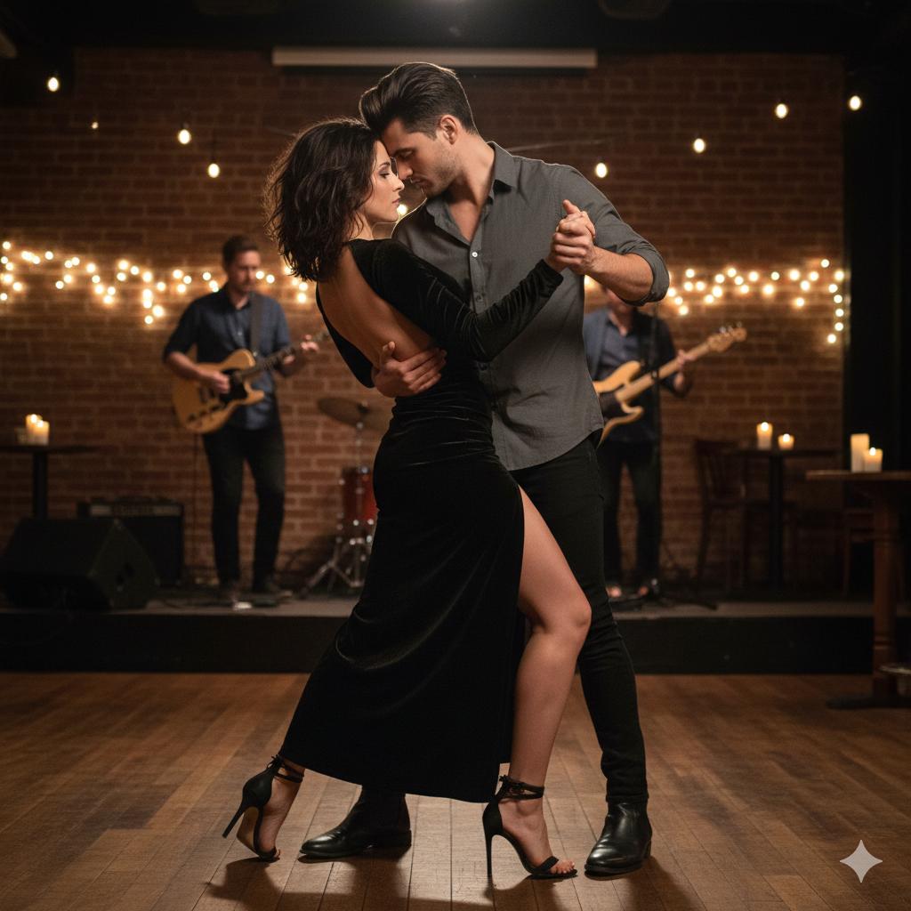 - Improvizace a Vedení: Neexistuje žádná pevná sekvence kroků. Partneři spolu komunikují prostřednictvím jemného a citlivého vedení trupem a rukama, přičemž se neustále přizpůsobují náladě hudby, frázování a textu písně. Tanec je plynulým dialogem mezi partnery.