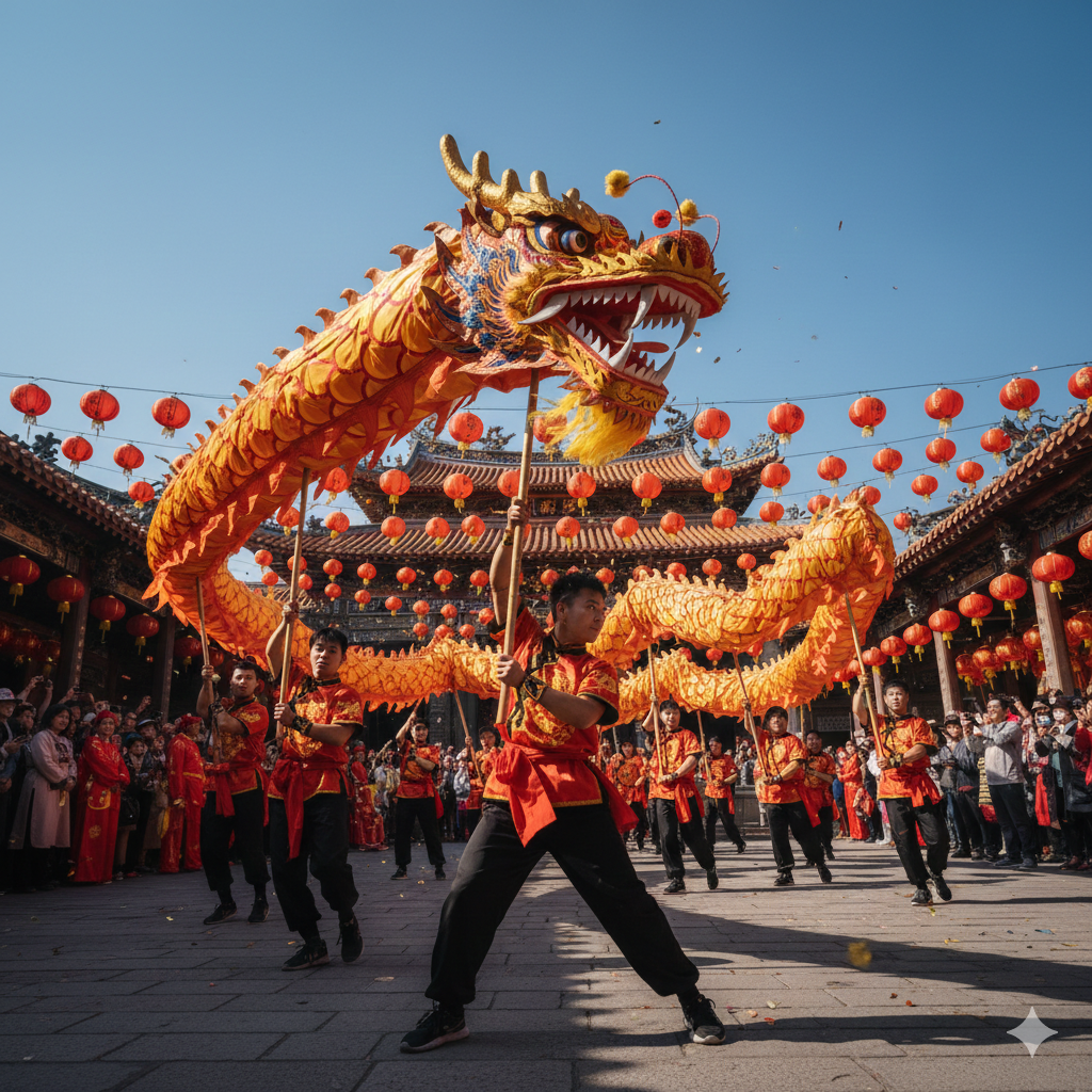 Kolektivní synchronizace: Na rozdíl od lvího tance (který tančí dva lidé) vyžaduje dračí tanec tým 9 až 15 (i více) tanečníků. Úspěch závisí na absolutní souhře – pokud jeden udělá chybu, celé tělo draka se zamotá.
