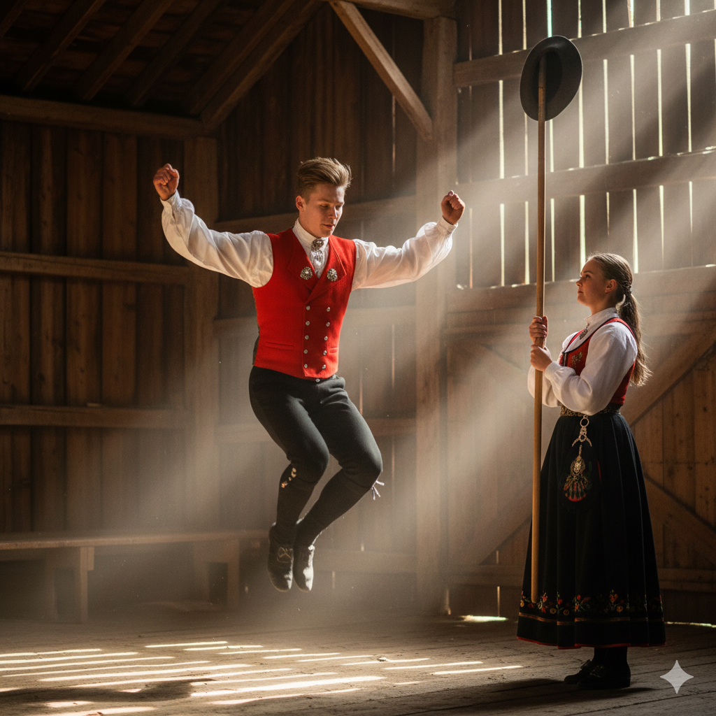 Hallingkast (Vrchol tance): Nejslavnější moment, kdy se tanečník vymrští do vzduchu a kopne do klobouku, který někdo (obvykle dívka) drží na tyči vysoko nad hlavou.
