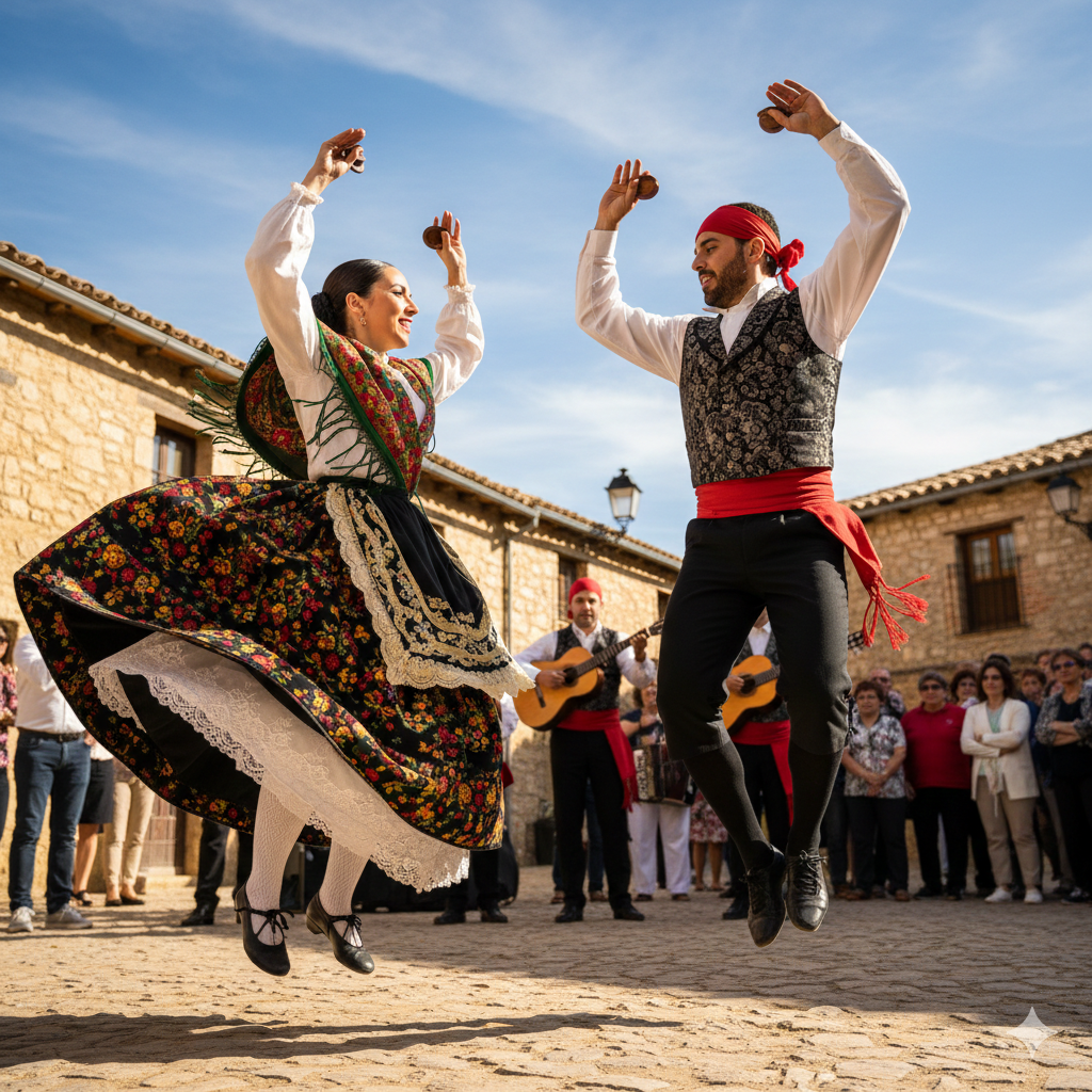 - Kostýmy: Liší se podle regionu. V Aragonii jsou to široké sukně, vyšívané zástěry a šátky (ženy) a bílé košile s vestami a širokými šerpami (muži).