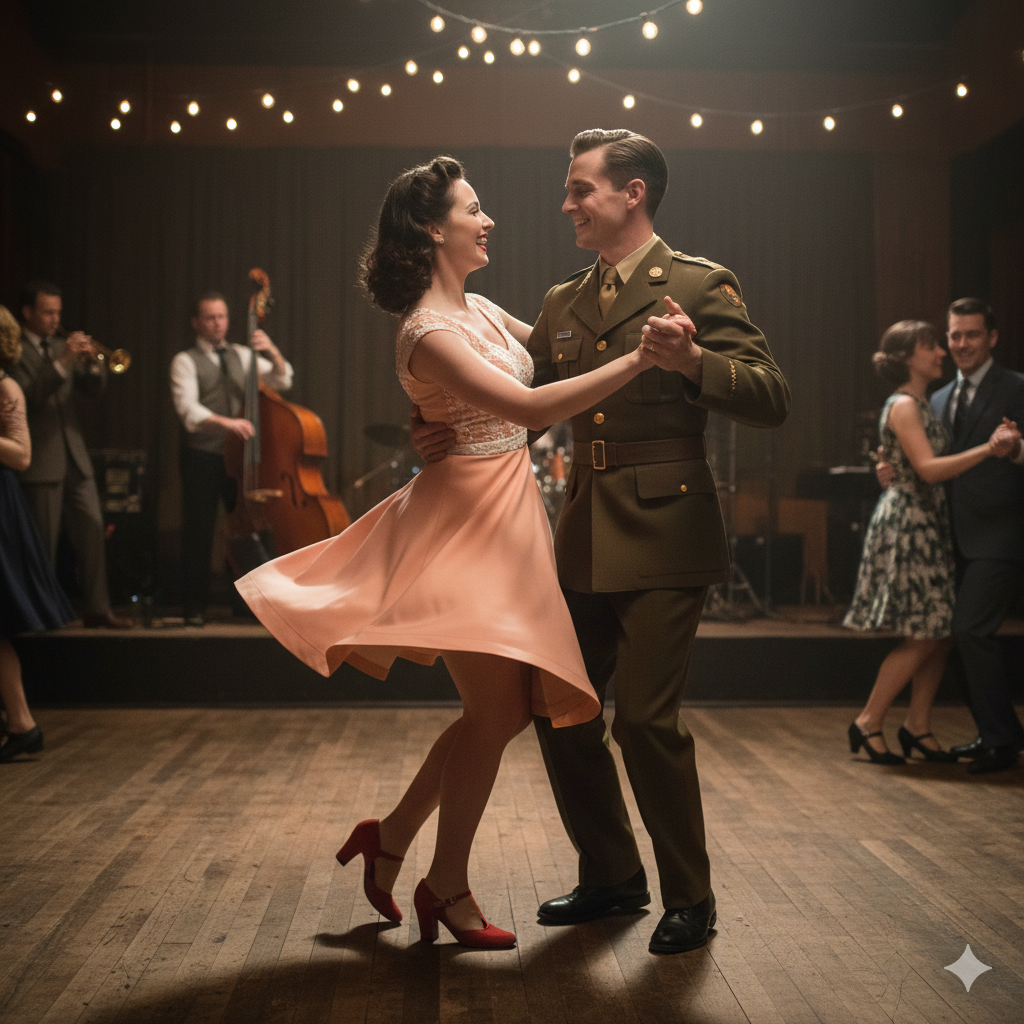 - Základní krok: Klíčovou figurou je Swing Out (Osmidobá figura, 8-count), kde se partneři oddělí a znovu spojí v pružném spojení. Tato figura je jádrem tance a vytváří elastické natahování a kompresi.