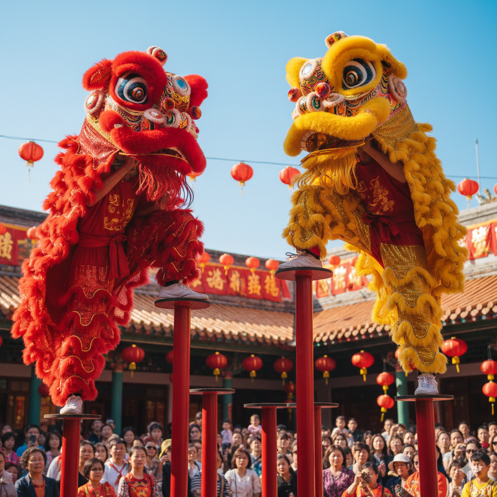 - Rituál "Hái lộc" (Trhání štěstí): Vrcholem tance je moment, kdy se lev snaží dosáhnout na zelený salát (skrývající peníze), který visí vysoko na budově. Úspěšné "sežrání" salátu znamená štěstí pro majitele domu.