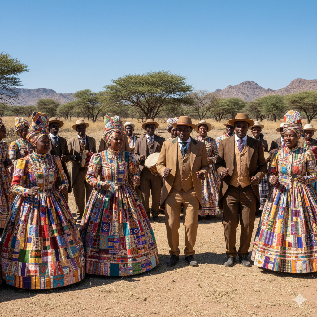 Zajímavým paradoxem je jejich tradiční oděv. Ženy Nama dodnes nosí dlouhé, pestrobarevné šaty viktoriánského střihu s mnoha spodničkami a šátky na hlavě. Tento styl původně převzaly od manželek německých misionářů, ale postupem času ho přetvořily v symbol národní hrdosti a odporu. Když uvidíte ženu v těchto šatech tančit v prachu pouště, vidíte vítězství kultury nad útlakem – vzaly si oděv svých utlačovatelů a udělaly z něj svůj nejcennější poklad.