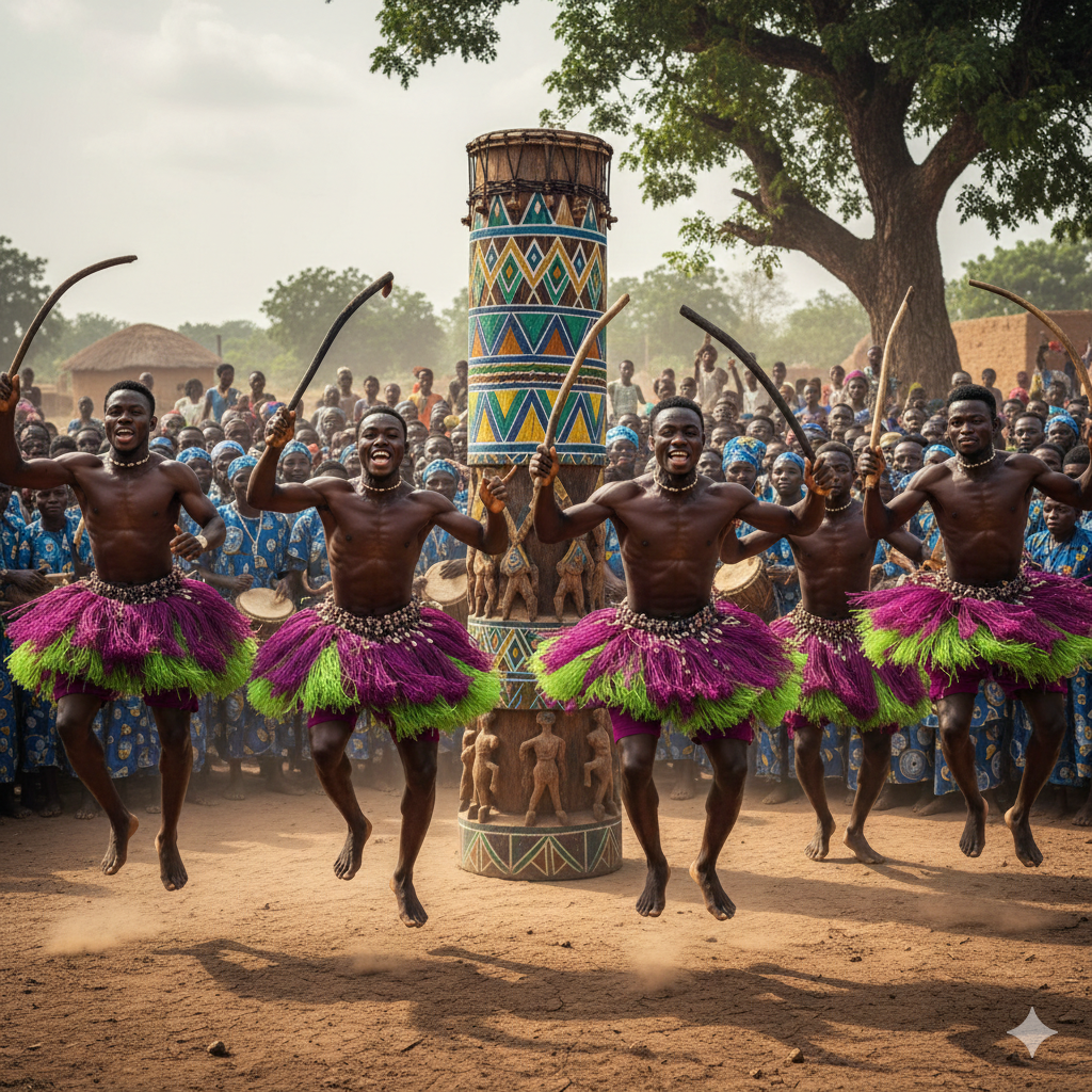 Pokud existuje něco, co etnikum Ogu definuje po zvukové stránce, je to Sato. Tento tanec není jen zábavou, je to hluboce spirituální a historický rituál. Bubny Sato jsou obrovské – často měří přes 1,5 metru – a k jejich rozeznění je potřeba neuvěřitelná fyzická síla a akrobacie. Podle legendy tanec Sato poprvé předvedli sirotci, aby uctili své zemřelé rodiče a přilákali pozornost komunity, která by se o ně postarala.