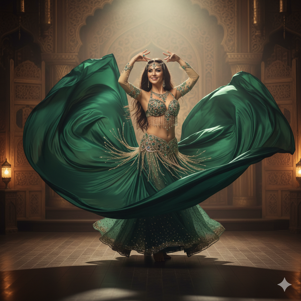 Práce se závojem: Závoj se často používá pro dramatický příchod na scénu. Tanečnice s ním manipuluje tak, aby zdůraznila svou linii a vytvořila kolem sebe auru tajemna, než ho odloží.