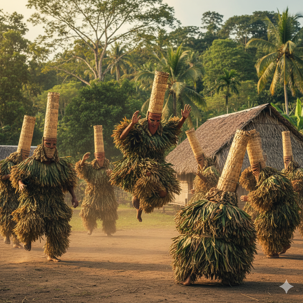 Tanečník je zahalen do obrovského "kabátu" ze sušených listů banánovníku, který při pohybu vydává hlasitý šustivý zvuk.
