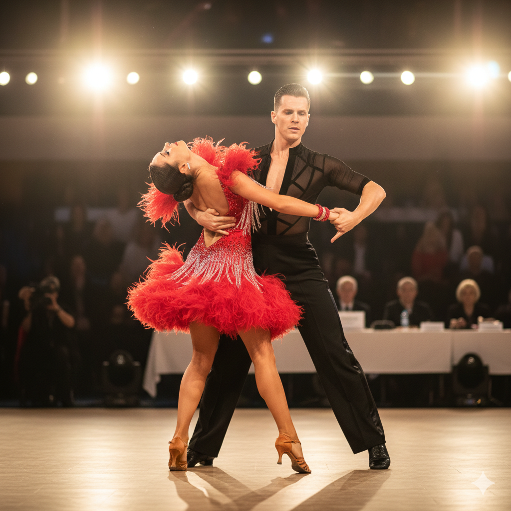 - Progresivní pohyb: Na rozdíl od statické Rumby je Samba tancem postupovým – páry se dynamicky pohybují po obvodu sálu proti směru hodinových ručiček.