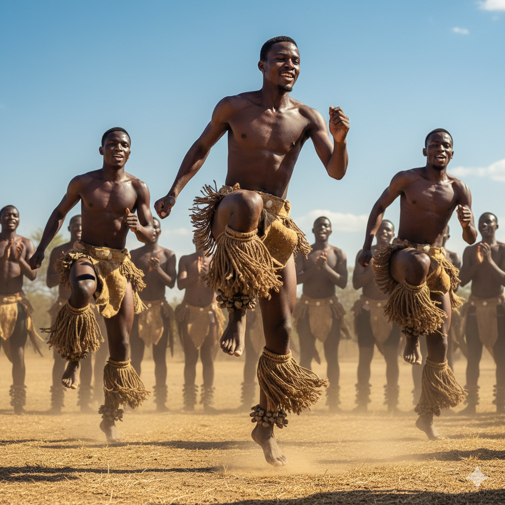 Nízké těžiště: Tanečníci se pohybují v mírném podřepu, což je typické pro mnoho tanců jižní Afriky a dodává pohybu na stabilitě a síle.