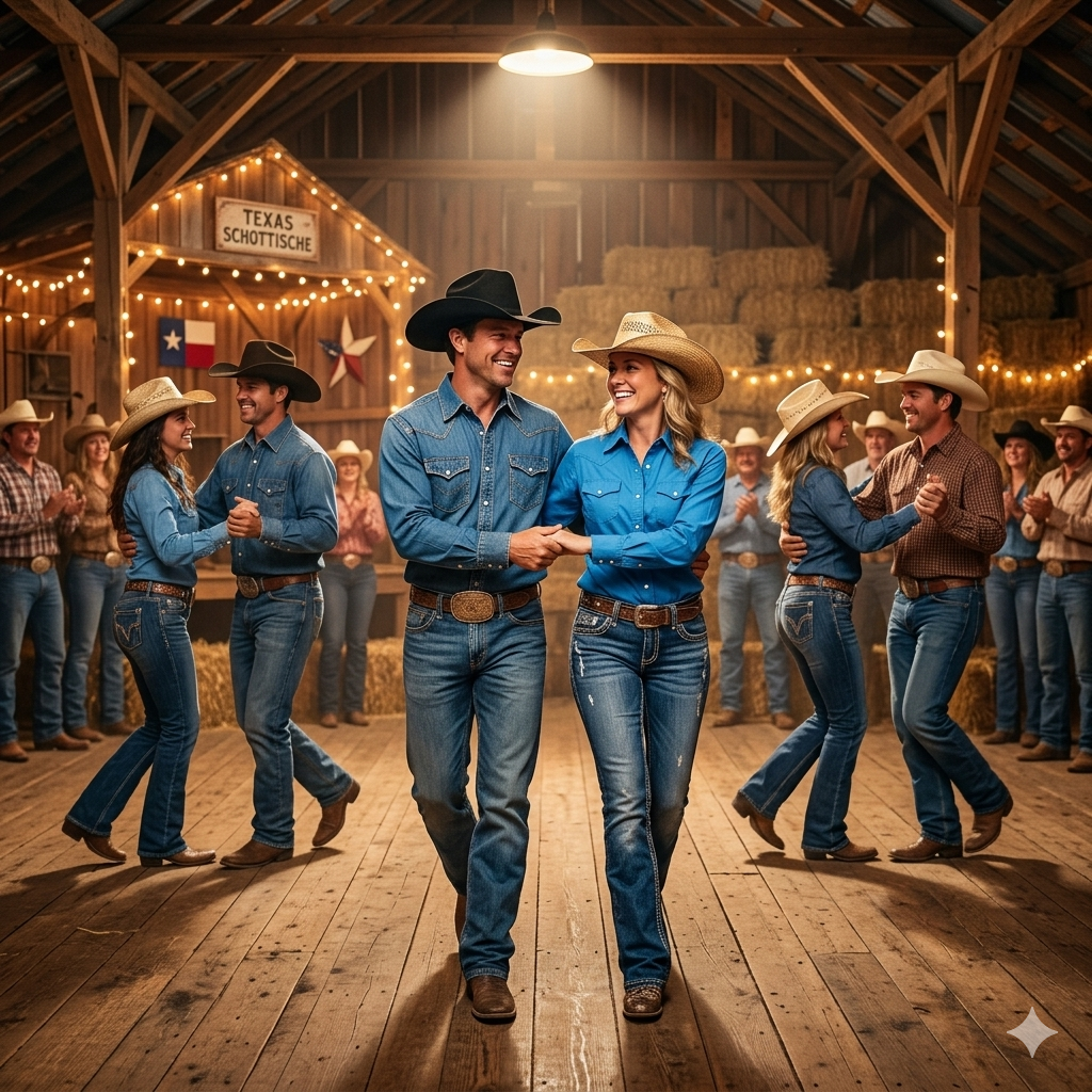 Texas Schottische je dokonalou ukázkou toho, co se stane, když se starosvětská evropská etiketa potká s prachem a svobodou amerického pohraničí. Je to tanec, který urazil cestu z nablýskaných salonů Viktorie až do texaských nálevn (honky-tonks), a přitom si zachoval svůj rytmický tep, i když vyměnil lakýrky za kovbojské boty.