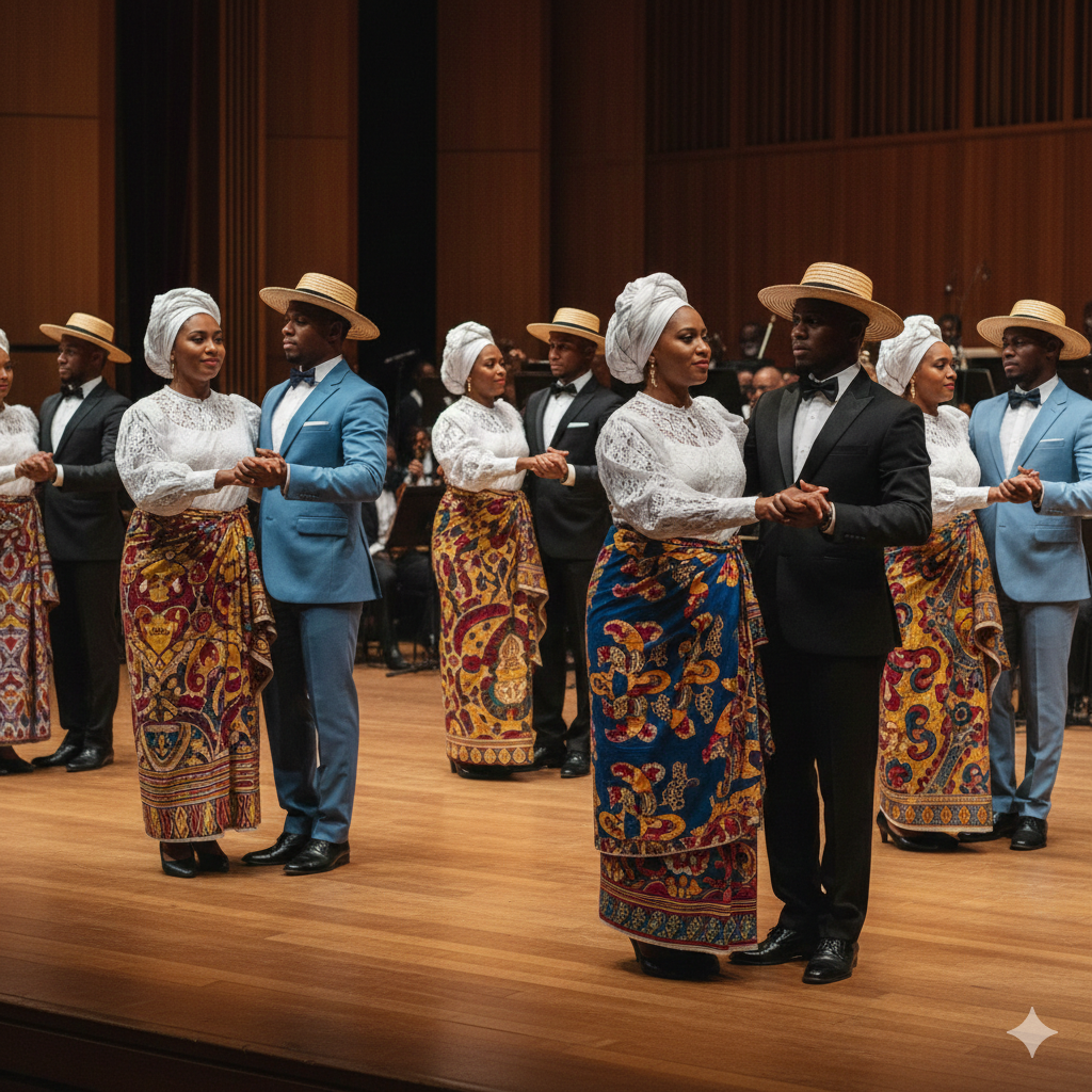 - Dvorská etiketa: Choreografie zahrnuje úklony, jemné vedení partnerky a uctivé rozestupy. Odráží snahu místních elit (Forros) napodobit evropskou šlechtu 19. století.